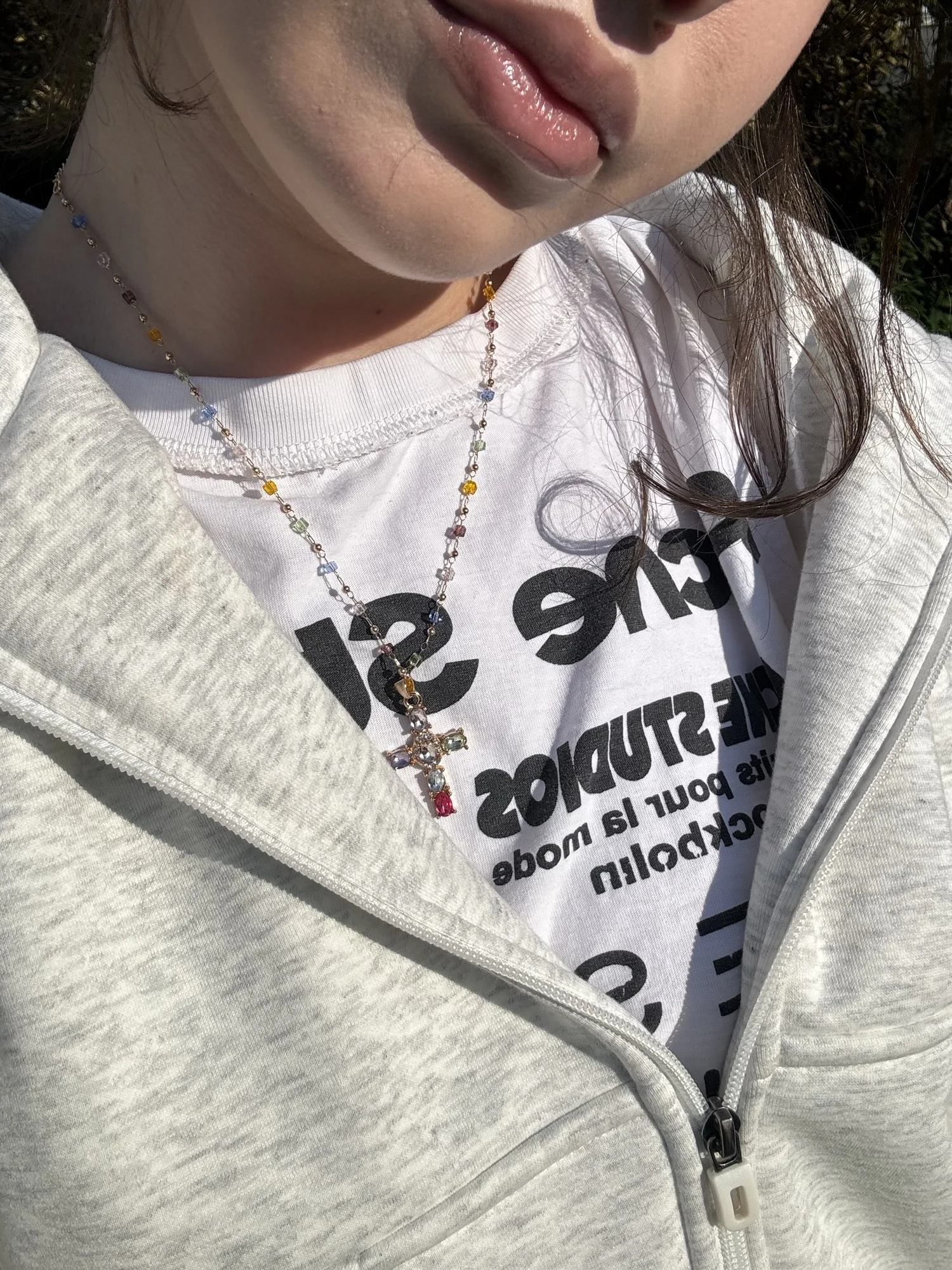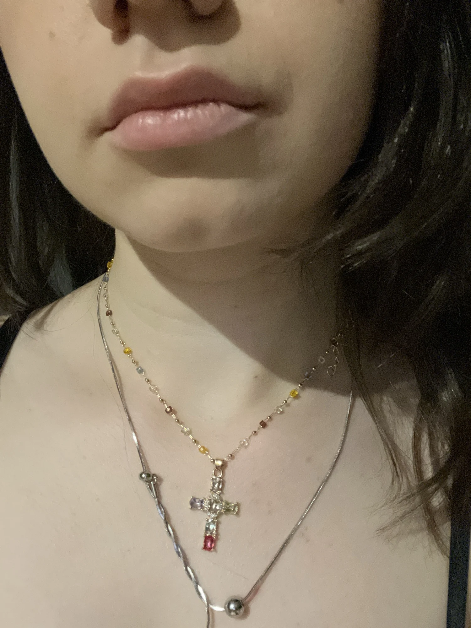 Suspended from a delicate chain with subtle bead details, this necklace sits gracefully at the neckline and adds a refined touch to both everyday outfits and special occasions. The multicolor gemstones symbolize hope, faith, and individuality, making this piece both meaningful and stylish.