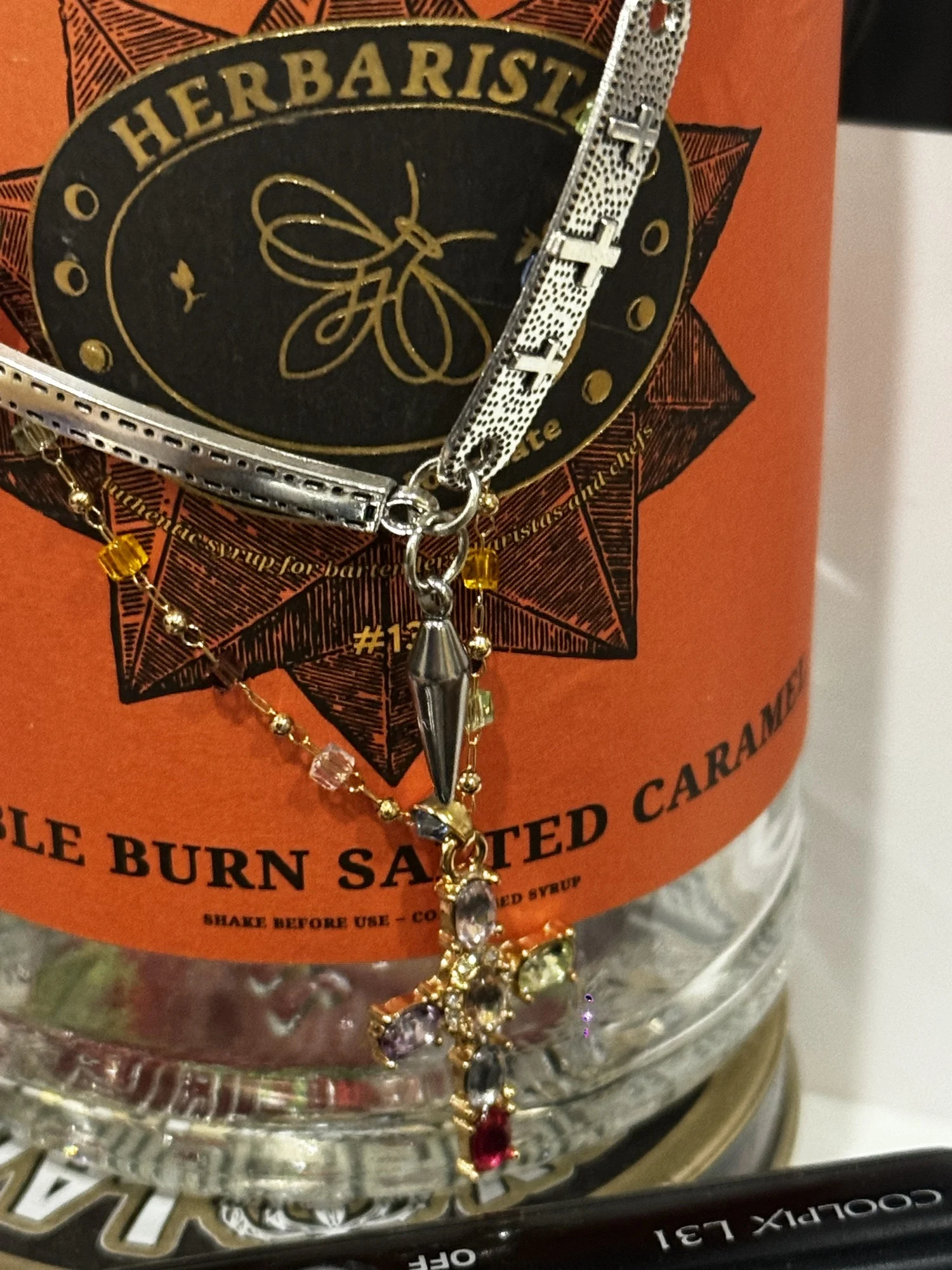 Graceful and radiant, this multicolor gemstone cross pendant necklace blends timeless symbolism with modern elegance. Featuring a beautifully arranged cross design accented with colorful gemstones, each stone catches the light to create a soft, luminous sparkle.