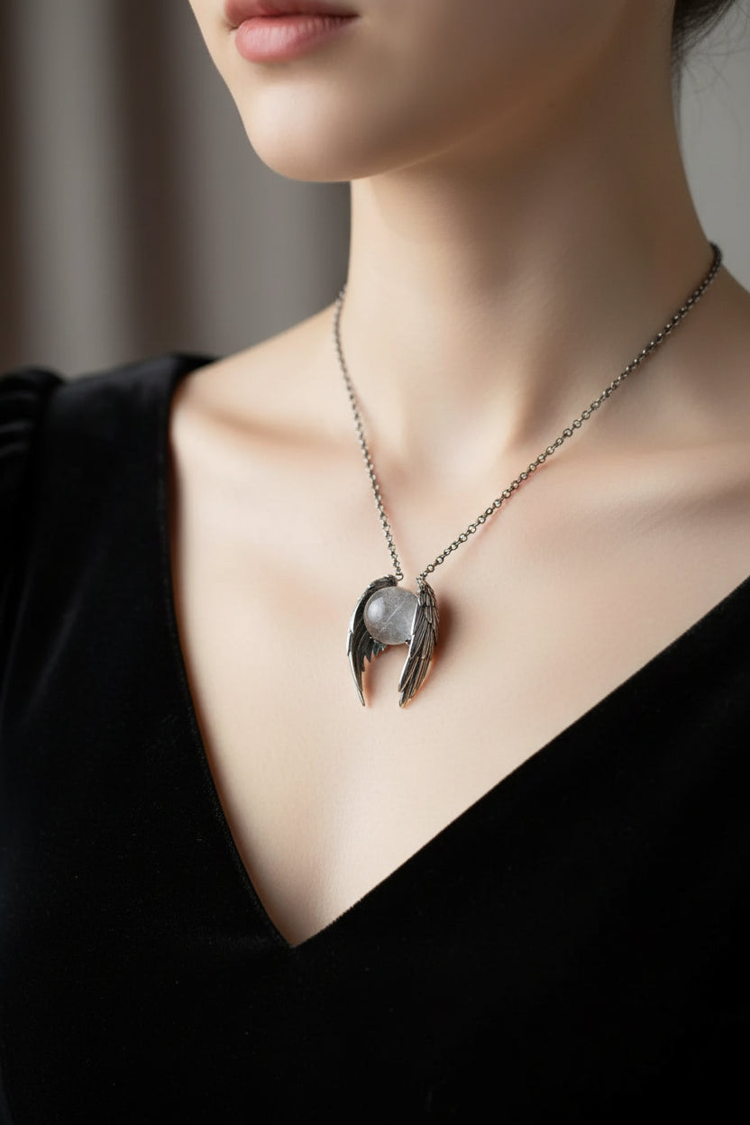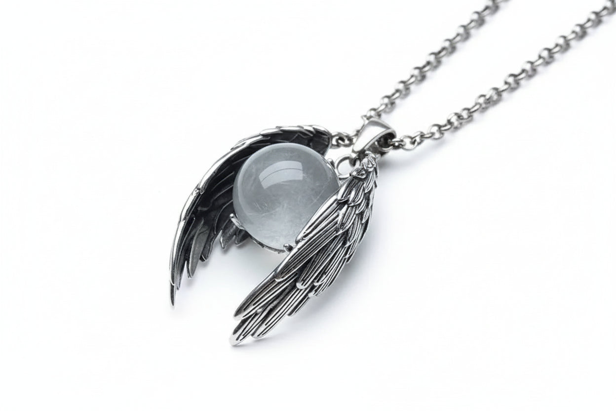 Striking and symbolic, this angel wing pendant necklace features a luminous crystal orb cradled between sculpted wings. The polished wings curve gracefully around the sphere, creating a powerful contrast between strength and serenity. The translucent crystal catches the light beautifully, adding depth and a soft glow to the design.